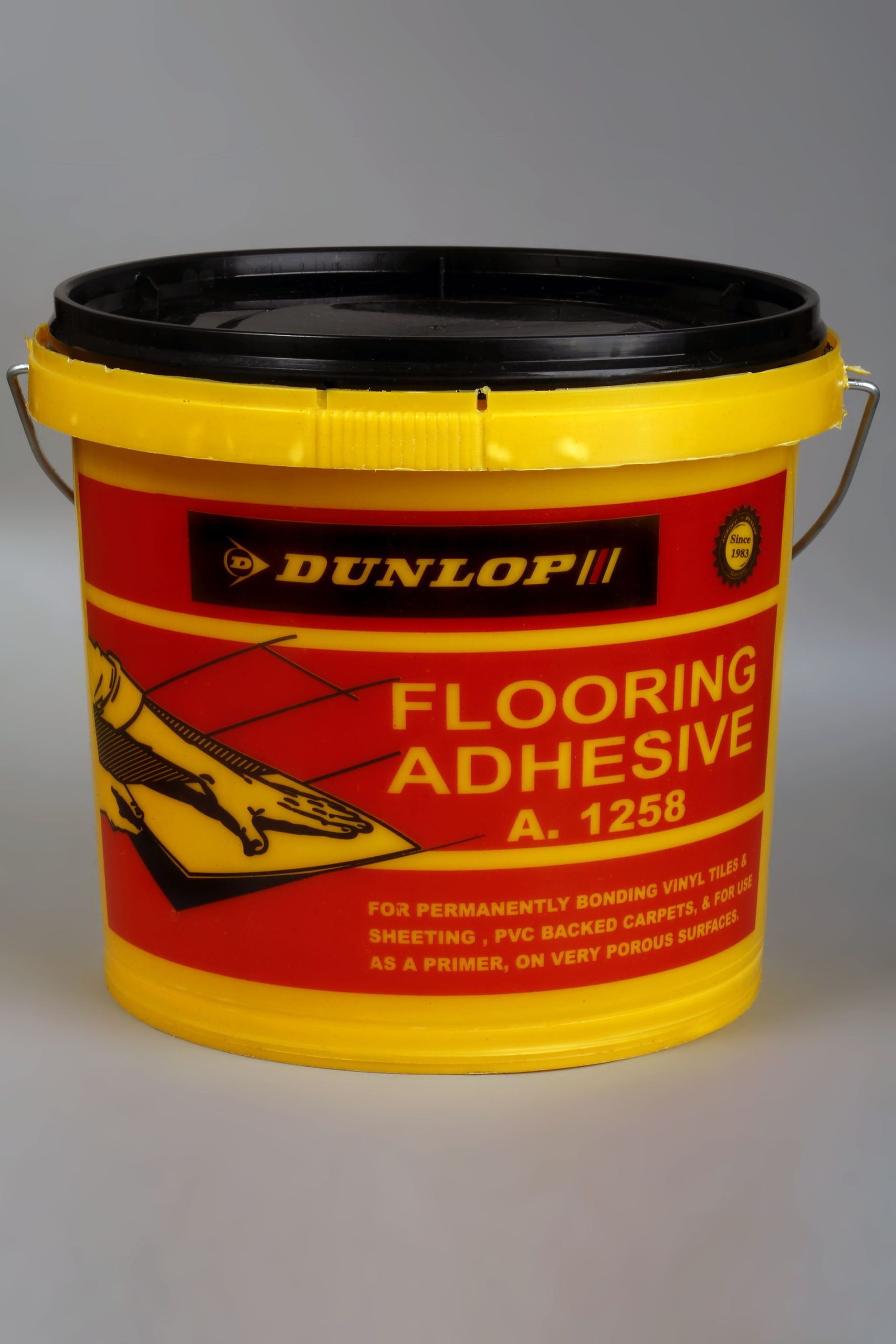 Flooring adhesive Dunlop A.1258 is a high tacky off-white emulsion adhesive which is very clean and easy to use. It has been specially designed for bonding vinyl sheet and tiles felt-backed floor covering materials to all normal sub-flooring surfaces, including concrete, wood, asphalt, hardboard …etc.