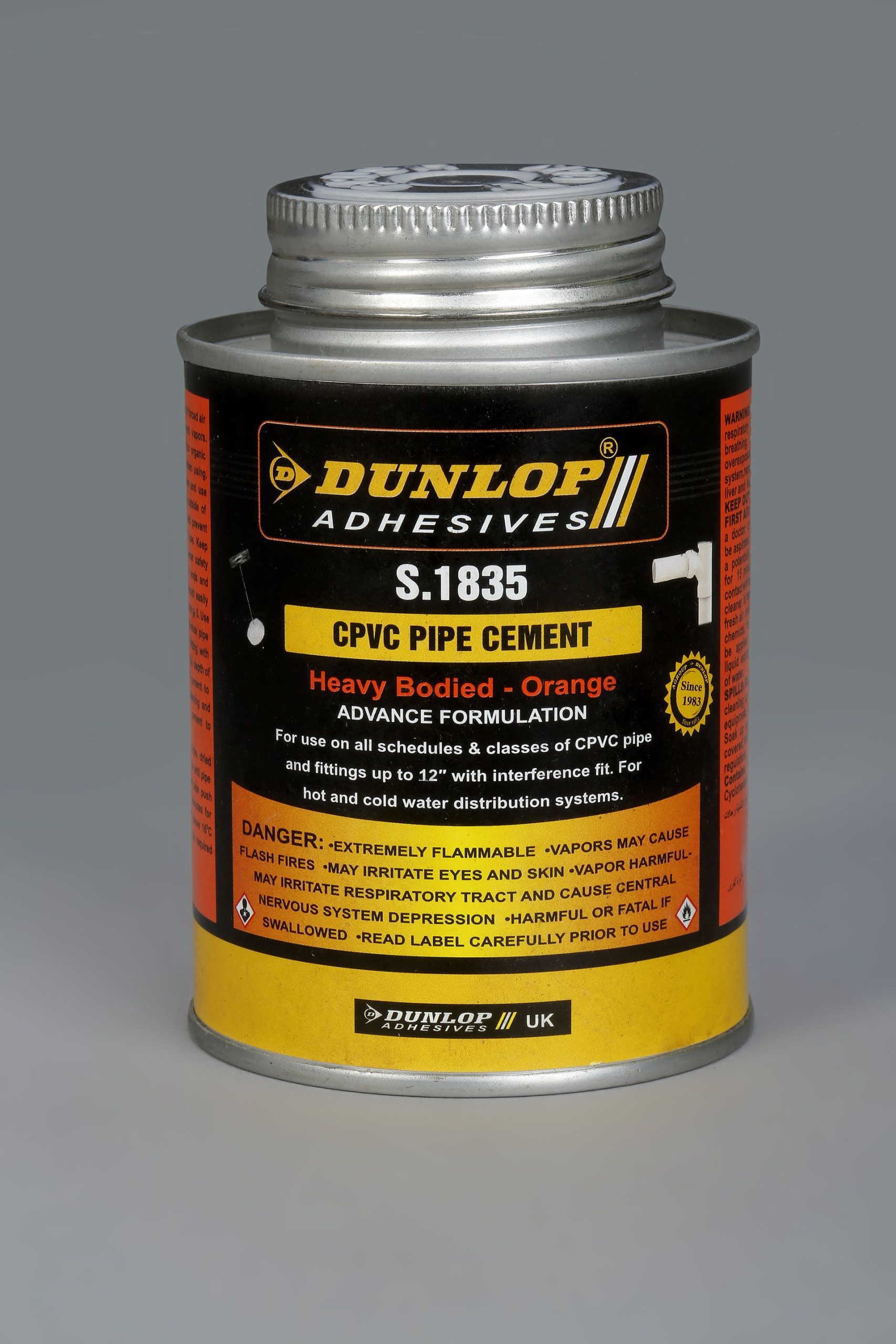 Dunlop S.1835 is a pipe weld cement (orange color) specifically developed for bonding rigid CPVC pipes. this adhesive can be used for many applications in the plastic molding industries as well as the building industry and general drainage system.[/av_textblock]